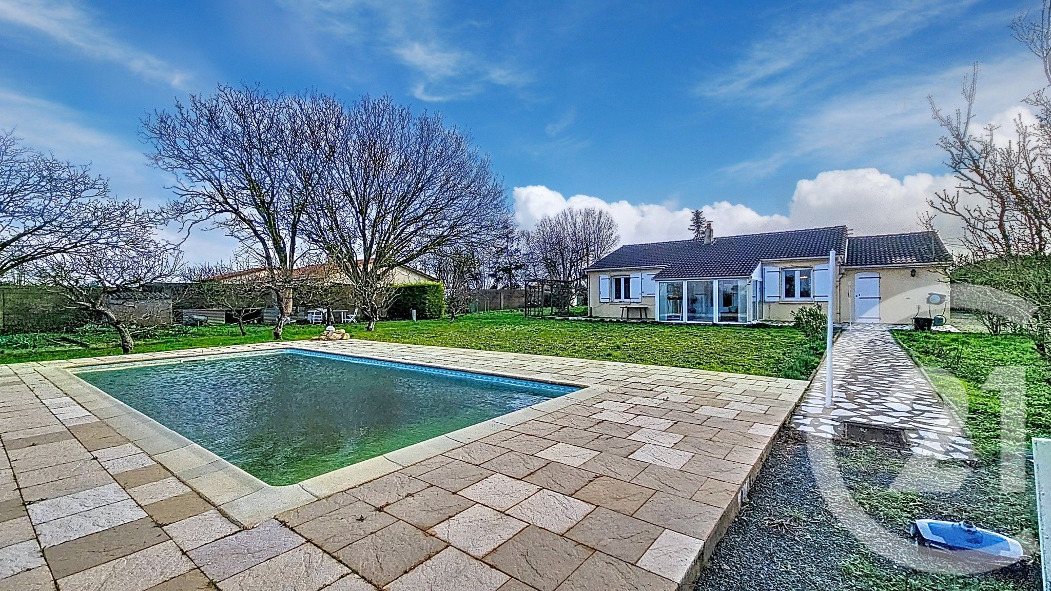 Vous profiterez d'un vaste extérieur verdoyant (potager, arbres fruitiers) et d'une piscine pour vos moments de détente en famille et entre amis.